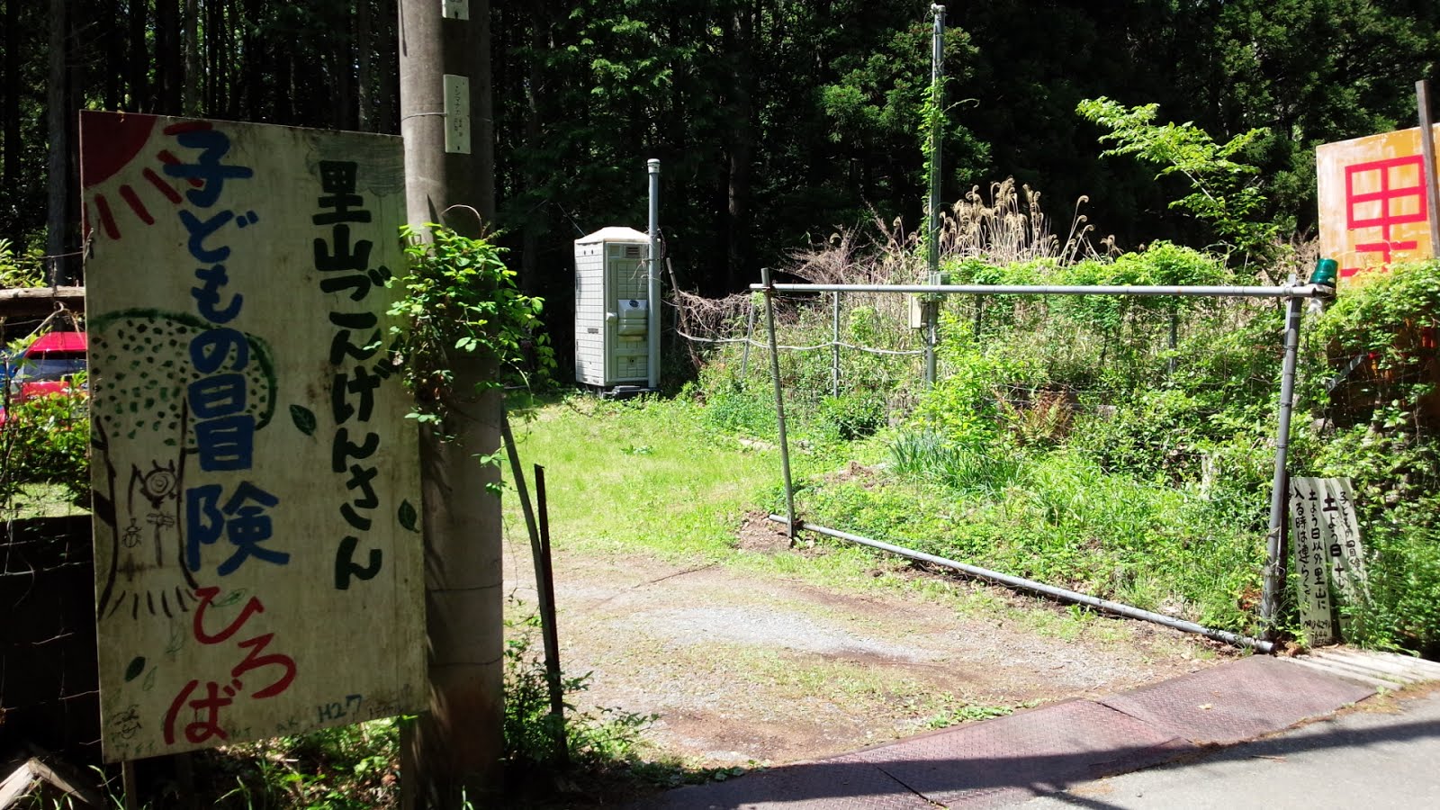 工事現場の簡易トイレの間に、里山ごんげんさんへの入口があります、鍵がかかっていますので開錠してお入りください。